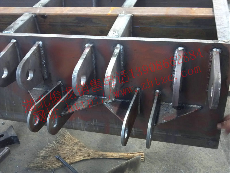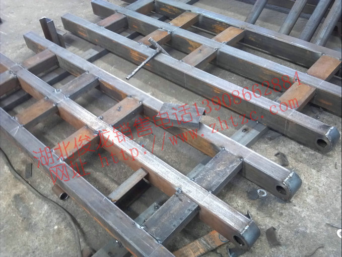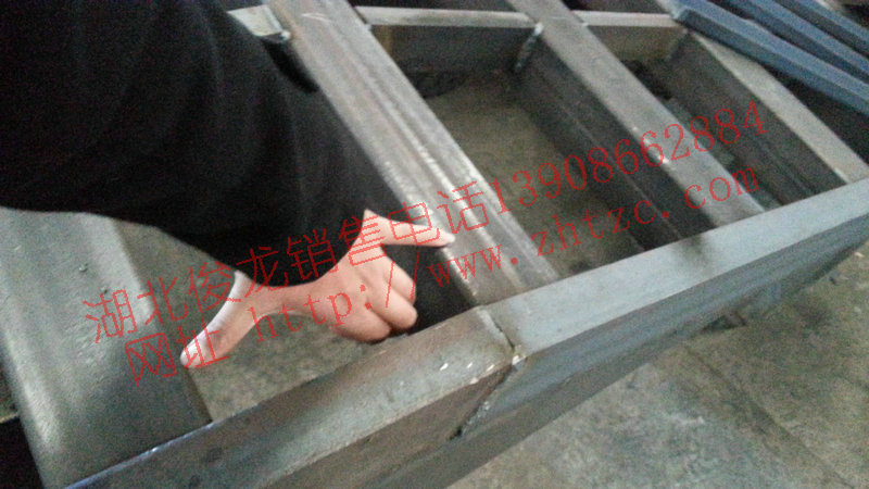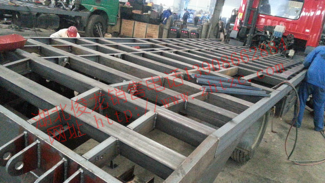 平板運輸車的平板部分,組成由副橫梁,邊梁,龍門架,面板,爬梯等組成。其中最重要的受力部分是副橫梁。一般來說單橋平板運輸車普遍采用100X100mm尺寸,5mm厚度的方筒型鋼橫鋪,間距根據(jù)用戶載重量不同和底盤大梁其他元器件的分布位置不同在20-39cm之間。