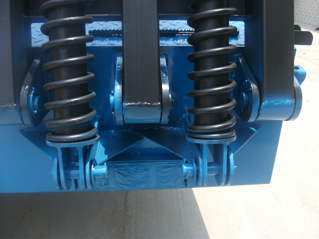 第二重要的主部件就是爬梯。爬梯現(xiàn)在都是雙邊雙簧,檢驗爬梯是否好用的標準就是是否結實和靈活。所謂的靈活就是不笨重,標準就是一個成年男性可以獨自翻起和落下,這樣說明各個爬梯軸,彈簧,卡梢等位置是經(jīng)過精心設計的,說明細節(jié)做到位了參數(shù)設計合理才能好用。至于是否結實,肉眼也能看出端倪:爬梯放下后是斜坡,挖機上車的時候有一定的沖擊力,而且整個挖機的重量都將壓在爬梯上。所以爬梯的用料一定要實在。一般好質量的平板運輸車爬梯都是每邊采用三根80X120mmX6mm的方筒型鋼制作,如下圖:這樣才能確保經(jīng)久耐用。部分廠家節(jié)約了中間一根方筒改用C型槽鋼代替,雖說可以節(jié)約一部分成本,但是長期沖擊爬梯必然變形。爬梯變形后導致彈簧扭曲,爬梯無法翻起落下,到時候再整改或者加固非常麻煩。