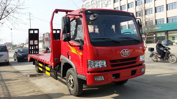 平板運輸車是專門用來拉挖掘機鉤機叉車等大型機械設備和工程機械的專用汽車。區(qū)別于一般的貨車載貨載重分布均勻的特點,拿平板運輸車最常見的用途拉挖掘機來說,挖掘機上下時必須要爬梯才能方便上下。挖掘機上下的時候?qū)ε捞莺驼嚨臎_擊非常大,所以必須要求爬梯的強度非常強才能經(jīng)久耐用。爬梯一般是用手動舉起和放下,所以平板運輸車廠家湖北俊龍專用汽車有限公司的平板運輸車產(chǎn)品都在爬梯上裝上兩根彈簧,而且對彈簧、彈簧支架的尺寸和位置通過精確計算設計制作,一個人就可以很方便的舉起和落下。平面承重部分因為挖掘機??康奈恢檬侵饕撝貐^(qū),我們在承重區(qū)加強方筒鋼鋪放密度,確保經(jīng)久耐用。目前是平板運輸車銷售的旺季,也正時值柴油車尾氣排放國三和國四切換的時候,很多平板運輸車用戶苦于沒有合適的國四平板運輸車產(chǎn)品,下面平板運輸車廠家湖北俊龍專用汽車有限公司為您推薦一款一汽解放出品底盤的平板運輸車產(chǎn)品,具體參數(shù)如下:
