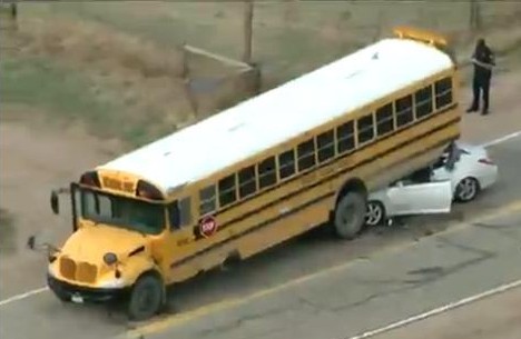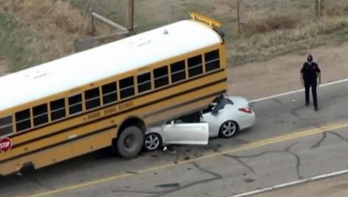小轎車受到的損毀嚴重,整體被擠扁,看圖應該是在撞到校車的后橋后才停止,可以想象當時的車速有多快。