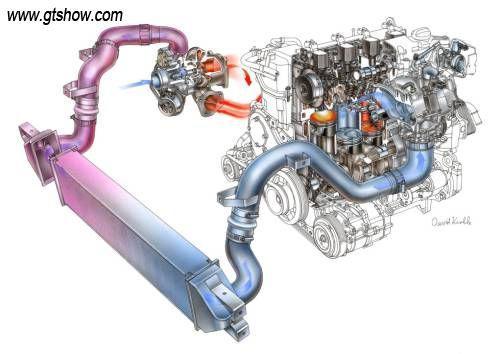 二、增壓中冷技術改善燃燒的另一要素——氧氣的利用率,增大進氣量,有助于減少廢氣排放和提高燃油經濟性。增壓中冷(又稱中冷增壓)是由增壓器和中冷系統(tǒng)組成。通過利用發(fā)動機排出的廢氣慣性沖力來推動渦輪室內的渦輪,渦輪有帶動同軸的葉輪,葉輪壓送由空氣濾清器送來的空氣,使之增壓進入氣缸。當發(fā)動機轉速增快,廢氣加速排出,帶動渦輪轉速增快,葉輪就壓縮更多的空氣進入氣缸,形成同步協(xié)調作用,最終增加發(fā)動機的輸出功率。
