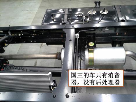 四、找DOC+POC后處理系統(tǒng)。這是最容易辨識的標志,只需要蹲下來從車底看排氣管上是否有兩個柱形罐狀裝置。國III車只有一個,即消音器;而國IV車則有兩個,其一為消音器,另一為DOC+POC后處理系統(tǒng)。