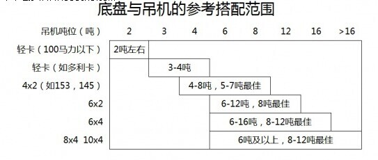對于底盤與吊機(jī)的匹配,因?yàn)橛龅降墓r和需求各不相同,還沒有一個確切的范圍,根據(jù)以往的購車經(jīng)驗(yàn),100馬力以下輕卡,如東風(fēng)小霸王可以安裝2噸左右的吊機(jī);東風(fēng)多利卡類型的輕卡可以安裝3-4噸的吊機(jī);145,153級別的4x2中卡可以安裝4-8噸的吊機(jī),5-7噸吊機(jī)為最佳(起重與運(yùn)輸能力平衡);6x2底盤可以安裝6-12噸吊機(jī),8噸吊機(jī)為最佳搭配;6x4底盤可安裝6-16噸吊機(jī),8-12噸為最佳;8X4底盤較6x4底盤還可安裝更大噸位的底盤。