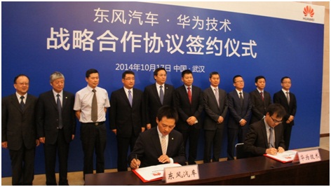 2014年10月17日,東風(fēng)汽車公司與華為技術(shù)有限公司在武漢簽署戰(zhàn)略合作協(xié)議,雙方將在汽車電子、智能汽車、IT/ICT信息化建設(shè)等領(lǐng)域,協(xié)同創(chuàng)新,展開跨界合作。這是東風(fēng)主動(dòng)把握移動(dòng)互聯(lián)網(wǎng)的新機(jī)遇,積極開展模式創(chuàng)新的重大戰(zhàn)略安排,也是華為拓寬業(yè)務(wù)領(lǐng)域的關(guān)鍵舉措。
