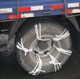 冬季北方由于雨雪冰凍天氣路上常會有積雪結(jié)冰,為保證行車安全,會在驅(qū)動輪上裝上防滑鏈。市場上主流的防滑鏈主要有鐵鏈、牛筋鏈、橡膠鏈和鋼絲繩防滑鏈。目前卡車上應(yīng)用最多的就是鋼鐵材質(zhì)防滑鏈。優(yōu)點(diǎn)是耐用、防滑效果好、價(jià)格便宜。缺點(diǎn)是對輪胎損傷較大,噪音較大。(牽引車最好帶兩套)