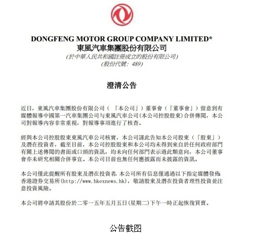 東風(fēng)集團(tuán)股份5日發(fā)布公告稱,近日,有媒體報(bào)道中國第一汽車集團(tuán)公司與本公司控股股東東風(fēng)汽車公司合并傳聞,經(jīng)核實(shí),截至目前,本公司控股股東和本公司均未得到來自于任何政府部門有關(guān)上述傳聞的書面或口頭的信息,均未向任何部門表示過此類意向,本公司董事會亦未研究相關(guān)合并事宜。本公司目前也無任何應(yīng)披露而未披露的信息。