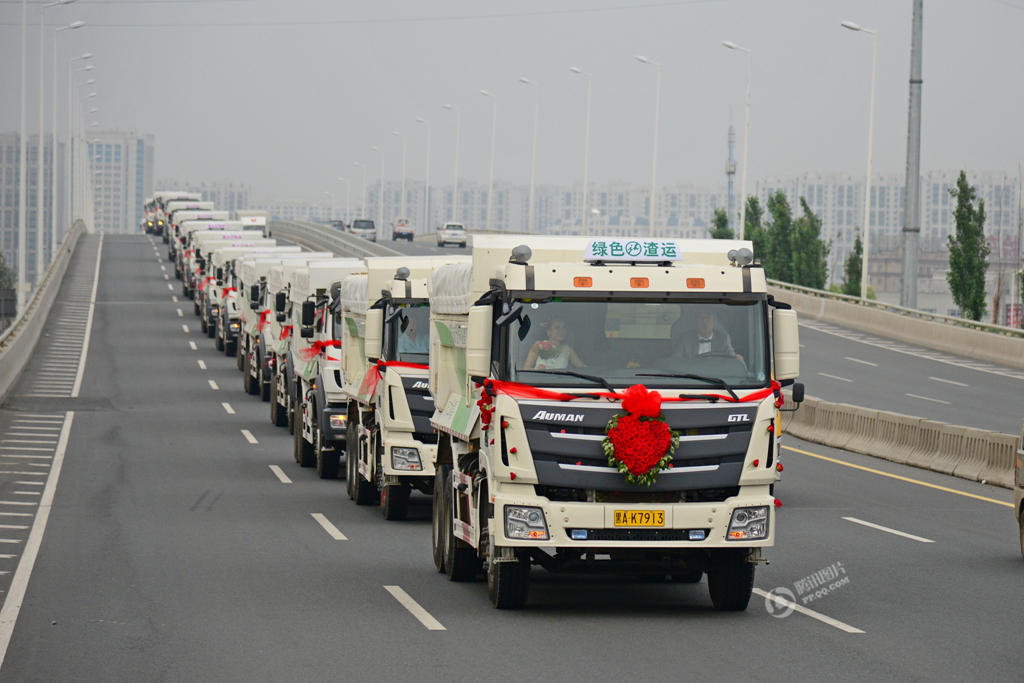 6月27日,哈爾濱市松北區(qū)新新怡園小區(qū)門(mén)前,36輛嶄新的綠色環(huán)保渣土車(chē)在路邊依次排開(kāi),每輛車(chē)車(chē)頭上都貼著大大的紅喜字,周?chē)鷿M了鮮花和氣球,浩浩蕩蕩的渣土車(chē)組成的接親車(chē)隊(duì)吸引了過(guò)往市民的目光。據(jù)新郎介紹,自己從事土方運(yùn)輸生意,36輛嶄新的渣土車(chē)也是新買(mǎi)的,因?yàn)榻裉焱瑯右彩枪鹃_(kāi)業(yè)的第一天,為了雙喜臨門(mén)的好兆頭,干脆就用新買(mǎi)的渣土車(chē)來(lái)接新娘。說(shuō)起結(jié)婚形式的獨(dú)特,新郎表示,“與媳婦談戀愛(ài)時(shí)就一直考慮結(jié)婚的形式,為了給她一個(gè)終生難忘的婚禮,經(jīng)過(guò)深思熟慮后,就決定要用自家的渣土車(chē)作為接親的車(chē)輛。而這一切,都是悄悄為妻子準(zhǔn)備的,只為了給她一個(gè)驚喜。