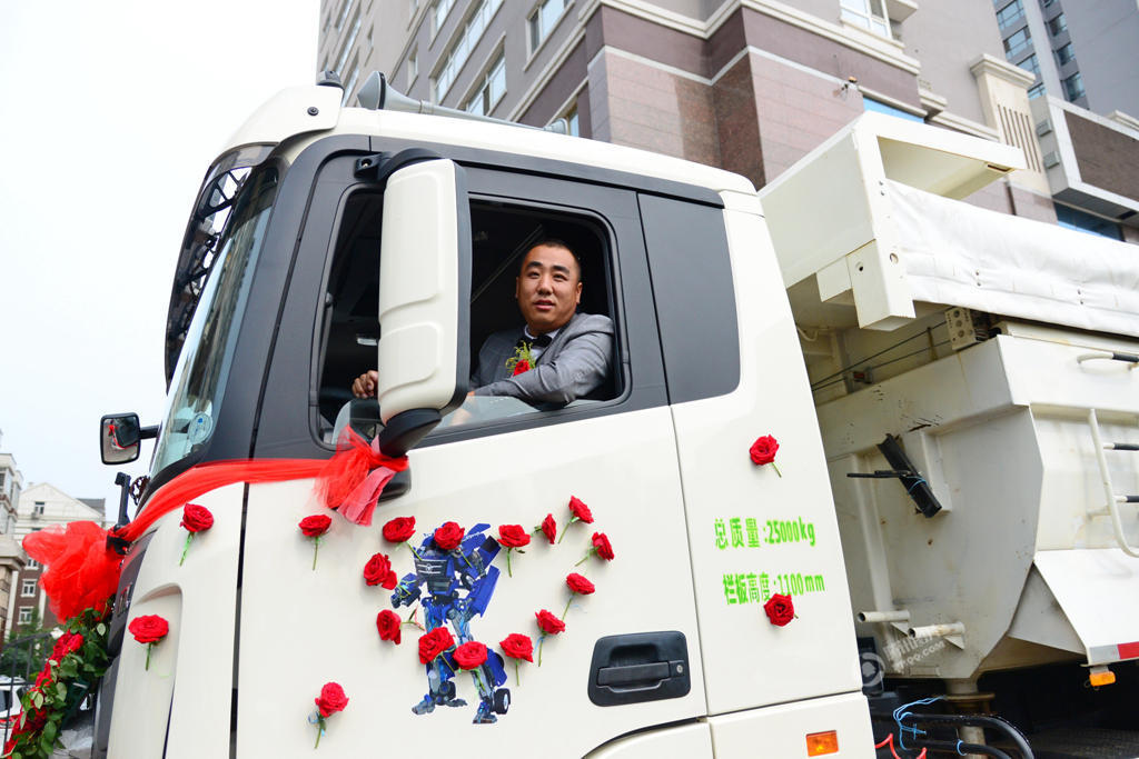 對(duì)于用心準(zhǔn)備的新郎,新娘表示,“其實(shí)我并不在乎婚禮有豪車(chē)或者辦得有多拉風(fēng),但我能感覺(jué)得到他的用心,所以我也十分支持他,而我也特別喜歡這種與眾不同的感覺(jué),這真的是一場(chǎng)讓我終身難忘的婚禮!”6月27日,哈爾濱,新郎開(kāi)著渣土車(chē)來(lái)接親。
