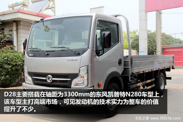 D28主要搭載在軸距為3300mm的東風(fēng)凱普特N280車型上,該車型主打高端市場,可見發(fā)動機的技術(shù)實力為整車的價值提升了不少。D28發(fā)動機采用高壓共軌+水冷,EGR系統(tǒng)+DOC+POC技術(shù)路線,排放標(biāo)準(zhǔn)符合國四要求。該發(fā)動機排量為2.771升,最大功率達到115馬力,在轉(zhuǎn)速達到2000rpm時扭矩可達260Nm。