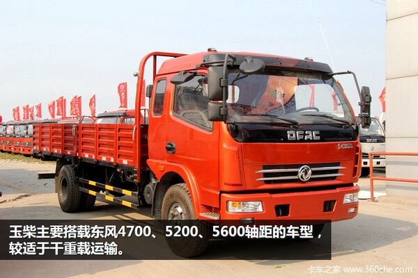 玉柴主要搭載東風(fēng)4700、5200、5600軸距的車型,也就是說D6、D7、D8、D9都有搭載玉柴的車型,這些車型有些也較適于干重載運輸,此時大馬力發(fā)動機就起到了很大作用。