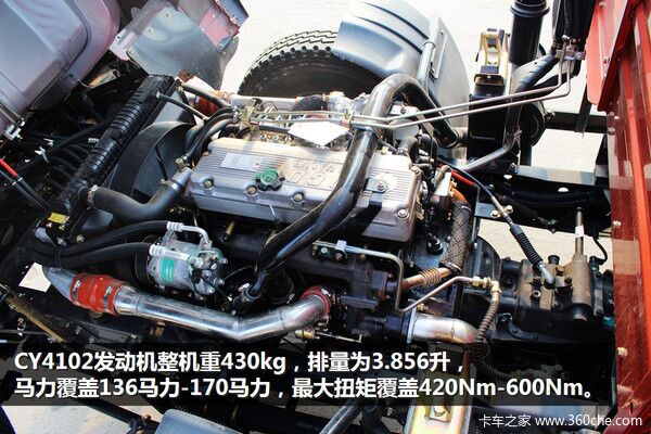CY4102發(fā)動機整機重430kg,排量為3.856升,馬力覆蓋136馬力-170馬力,最大扭矩覆蓋420Nm-600Nm,采用高壓共軌及EGR+DOC+POC技術(shù)路線滿足國四排放標(biāo)準(zhǔn)。