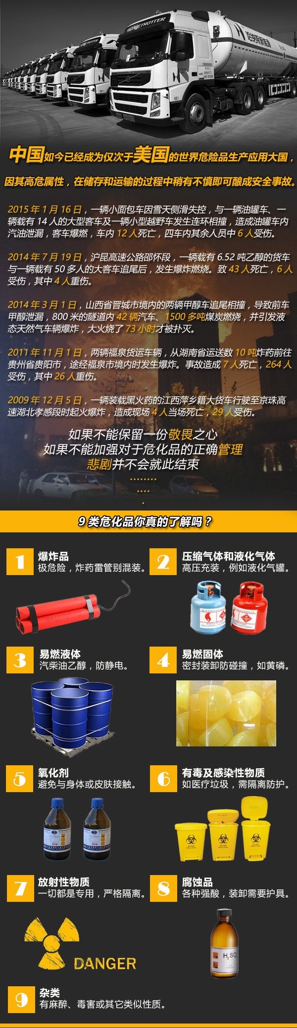中國如今已經(jīng)成為僅次于美國的世界危險品生產(chǎn)應用大國,因其高危屬性,在儲存和運輸?shù)倪^程中稍有不慎即可釀成安全事故。正確認識?;罚莆湛茖W的倉儲及運輸安全技巧,才能避免災難的再次發(fā)生。