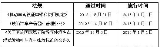 馬上就是2013年了,新的一年很多和汽車相關(guān)的道路交通和管理法規(guī)都將開始生效。大家耳熟能詳?shù)氖切碌摹稒C(jī)動車駕駛證申領(lǐng)和使用規(guī)定》,但是除了“新交規(guī)”,還有“國V標(biāo)準(zhǔn)”“首部召回制度”的正式實(shí)施都已經(jīng)進(jìn)入了倒計(jì)時(shí)。廠商、開車族們的功課是否已經(jīng)做好?各類規(guī)則的調(diào)整,是否已經(jīng)了然于胸?下面,湖北俊龍專用汽車有限公司的編輯就為您盤點(diǎn)一下2013年元旦起將實(shí)施的汽車法規(guī)。