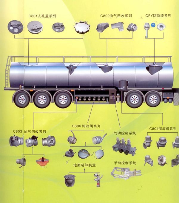 下裝油油罐車主要產(chǎn)品配件有:人孔蓋、油氣回收閥、油氣回收接頭、海底閥(緊急切斷閥)、卸油閥、防溢流傳感器等。產(chǎn)品具有設(shè)計(jì)合理,工藝先進(jìn),安全可靠,節(jié)能環(huán)保等優(yōu)點(diǎn)。