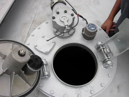 上圖可以很方便的看出來(lái),油罐車可以分倉(cāng)的,每一個(gè)倉(cāng)都需要一鋁合金罐口(也稱為人孔),可以帶防溢漏探頭,海底閥,卸油接頭,海底閥,又稱緊急切斷閥,安裝于罐體底部,進(jìn)行下裝加油時(shí)使用,操作簡(jiǎn)便、節(jié)時(shí)、安全環(huán)保。