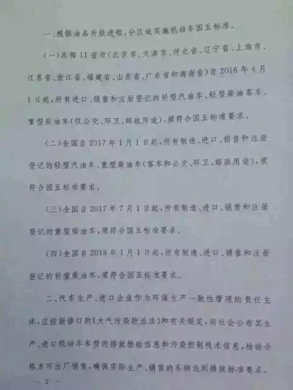 (二)全國自2017年1月1日起,所有制造、進(jìn)口、銷售和注冊登記的輕型汽油車、重型柴油車(客車和公交、環(huán)衛(wèi)、郵政用途),須符合國五標(biāo)準(zhǔn)要求。