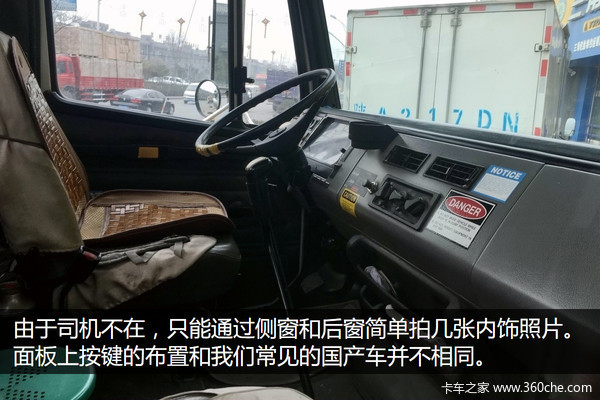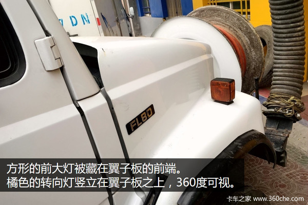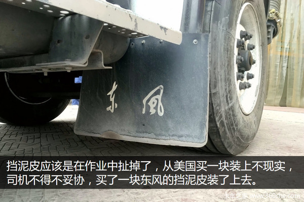 其中又一邊前輪上的擋泥皮應(yīng)該是在作業(yè)的過程當(dāng)中扯掉了,從大洋彼岸的美國買一塊過來裝上去不太現(xiàn)實(shí),司機(jī)不得不妥協(xié),買了一塊東風(fēng)的擋泥皮裝了上去。