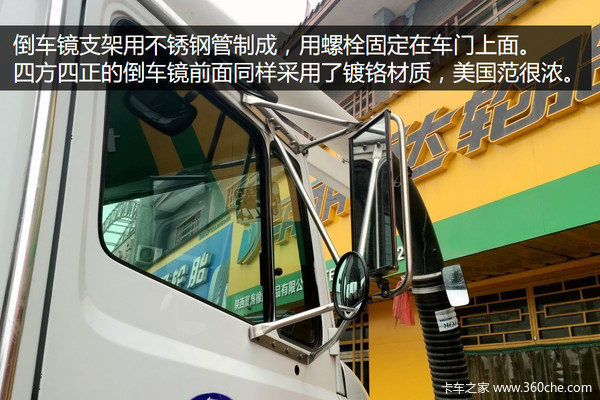 看起來有些略微復(fù)雜的倒車鏡支架用不銹鋼管制成,通過螺栓固定在車門上面,三角結(jié)構(gòu)可以讓倒車鏡的震動更小。四方四正的倒車鏡前面同樣采用了鍍鉻材質(zhì),這樣符合美國人的審美習(xí)慣。不知道后視鏡下方的凸面鏡是不是進(jìn)入國內(nèi)之后進(jìn)行了改裝,看起來和后視鏡有些重疊,車輛前方的補(bǔ)盲鏡被裝在了吸污管上面。