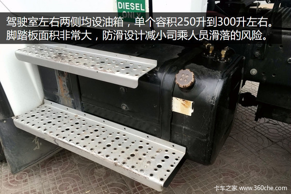 駕駛室左右兩側(cè)的下方均為油箱,目測單個(gè)容積大概在250升到300升左右,很奇怪油箱蓋上面為什么沒有加鎖,難道美國那邊沒有油耗子的嗎?油箱的上下端裝了鍍鋅鋼板做成的腳踏板,面積非常的寬大,加上防滑設(shè)計(jì),司乘人員上下車意外滑落的情況應(yīng)該會極少發(fā)生。