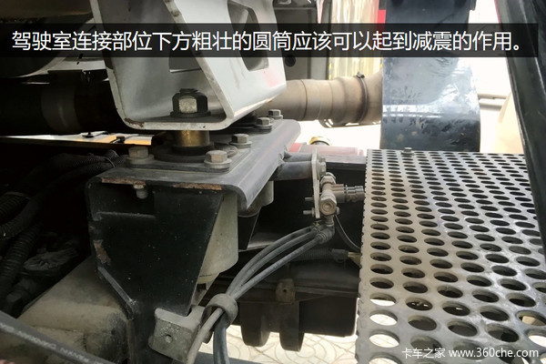 駕駛室后方的懸架裝置比較有意思,看上去好像是用硬連接的方式固定在支架上面。但通過仔細(xì)的觀察應(yīng)該不是這么簡單,猜測連接部位下方粗壯的圓筒應(yīng)該可以起到減震的作用,有對這樣設(shè)計(jì)比較熟悉的朋友可以在文章下面跟帖給我們普及一下。