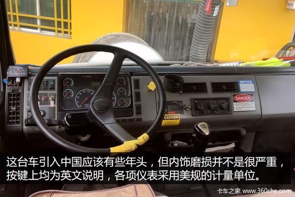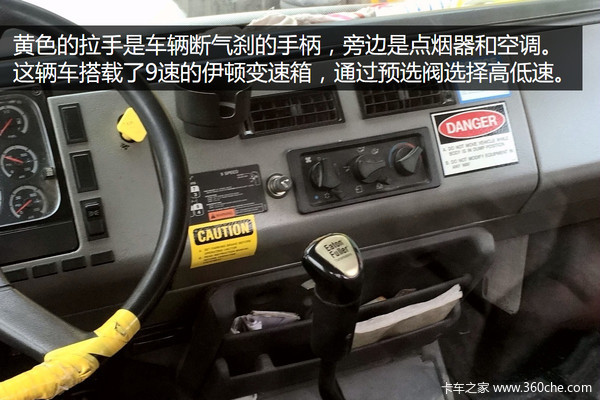 方向盤右邊的面板上按鍵就相對來說比較簡單,黃色的應(yīng)該是斷氣剎的操作拉手,旁邊是點(diǎn)煙器和空調(diào)的旋鈕開關(guān)。黑色的貼紙上面可以看出這輛車搭載了9速的伊頓變速箱,并通過預(yù)選閥進(jìn)行換擋操作。