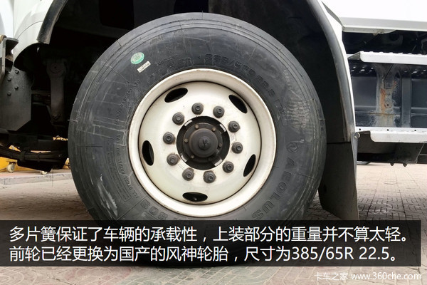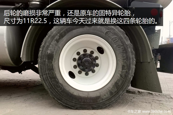 多片簧的懸掛保證了車輛的承載性。導(dǎo)向輪原裝輪胎已經(jīng)更換為國產(chǎn)385/65R 22.5風(fēng)神大寬胎,驅(qū)動輪上面則采用了固特異11R22.5輪胎,后胎的磨損已經(jīng)非常嚴(yán)重,這臺車今天過來就是來更換這四條輪胎的。