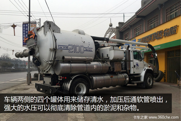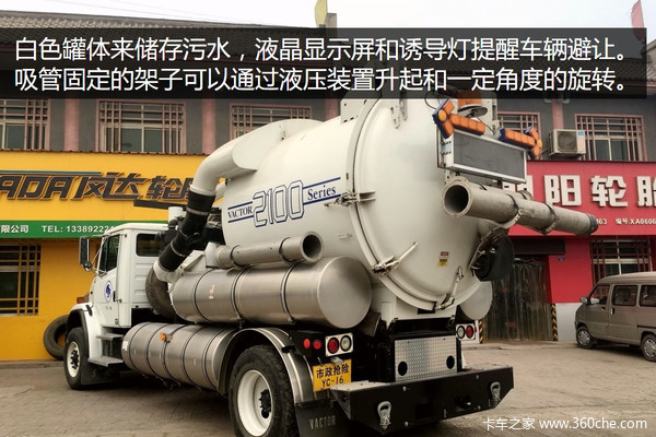 上裝可以分為兩個(gè)部分來說,其中巨大的白色罐體和垂在車輛前面的軟管主要用途是將污水或者雜物吸出來暫時(shí)儲存在罐體內(nèi)運(yùn)輸?shù)絼e處進(jìn)行傾倒。白色的罐體作為污水的容器后方的蓋子可以打開,并且可以像自卸車斗一樣升起好將管內(nèi)的污水排出。