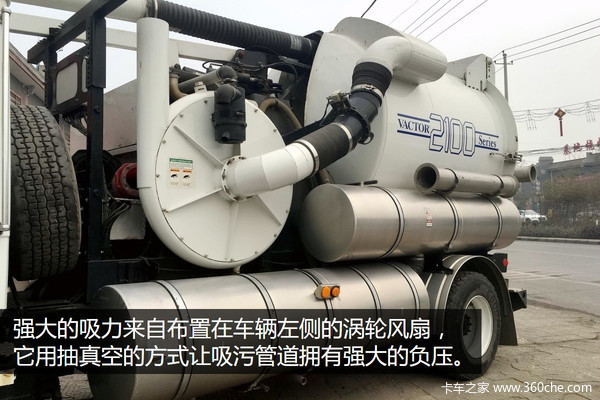強(qiáng)大的吸力來自布置在車輛左側(cè)的渦輪風(fēng)扇,它用抽真空的方式讓吸污管道擁有強(qiáng)大的負(fù)壓,抽起沉淀的淤泥以及砂石不在話下。