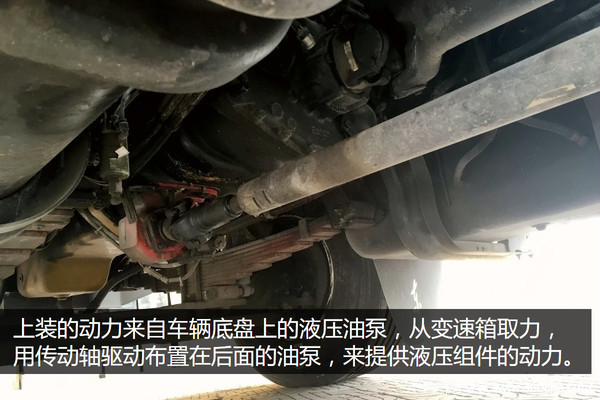 上裝部分的動力來自車輛底盤上的液壓油泵,從變速箱的并聯(lián)接口取力,用傳動軸直接驅(qū)動布置在后面的油泵,來提供液壓組件的動力。