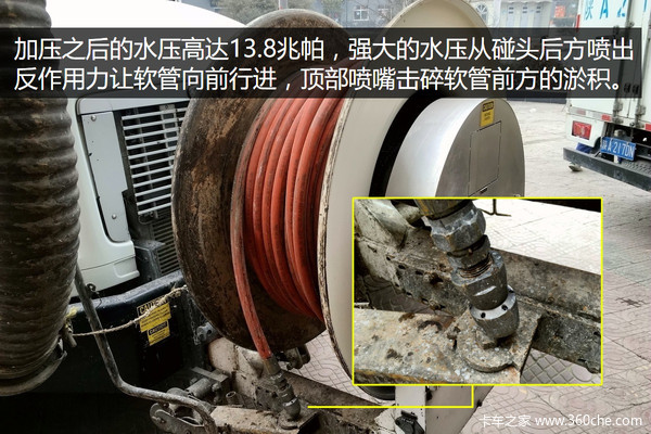 布置在車輛兩側(cè)的四個(gè)罐子主要用來儲存清水,加壓之后通過布置在車輛前方的軟管噴頭噴出,強(qiáng)大的水壓可以讓軟管在狹小的管道內(nèi)向前移動,并沖洗出管道內(nèi)附著的雜物以及淤泥。這也就是這臺清污車的另外一項(xiàng)功能。先用高壓水將管道內(nèi)的淤積物沖洗出來,再通過吸污裝置將污水以及雜物帶走,徹底起到管道清污的作用。