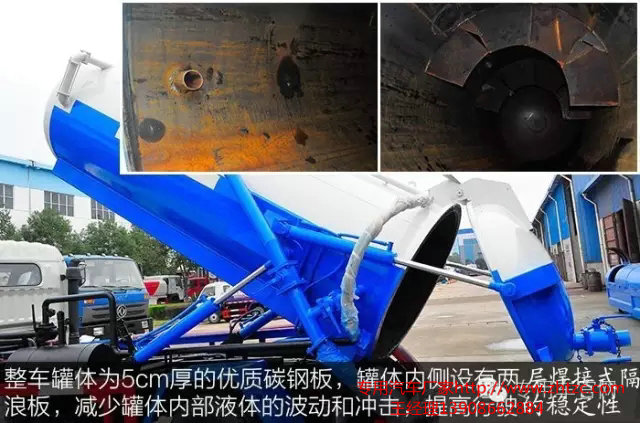 整車罐體為5cm厚的優(yōu)質(zhì)碳鋼板,罐體內(nèi)側(cè)設(shè)有兩層焊接式隔浪板,減少罐體內(nèi)部液體的波動(dòng)和沖擊,提高吸污車行駛的穩(wěn)定性。罐體內(nèi)壁還設(shè)置有自流口,用于下水道污泥抽吸,清撈,裝卸。罐體可后開(kāi),雙頂自卸。