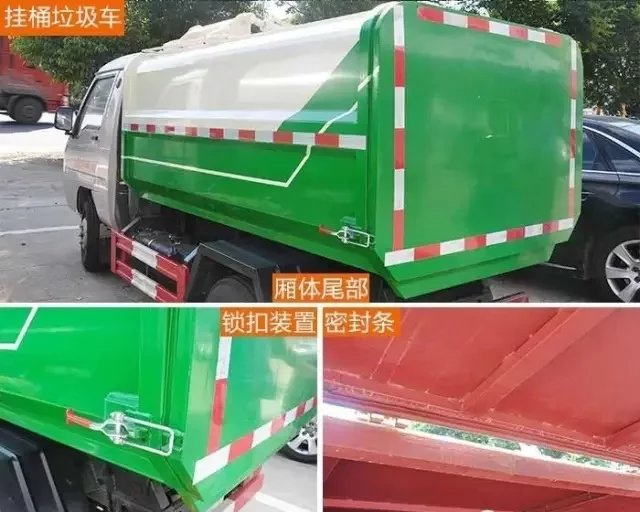 兩車廂體尾部都采用圓滑形四方設(shè)計,且均帶有鎖扣裝置,在門跟廂體尾部之間加裝密封條及鎖扣裝置,防止垃圾泄露。
