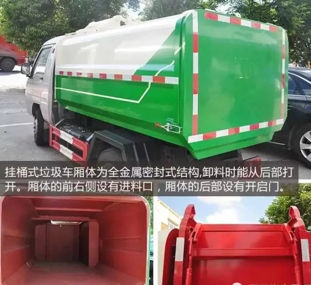 掛桶式垃圾車,廂體全金屬密封式構(gòu)造,采用鋼板和槽鋼焊合而成,垃圾車廂體下部有貨廂底架,垃圾車廂體經(jīng)垃圾車廂體底架用騎馬螺栓與底盤緊密相聯(lián)。其工作方式是在廂體前右部裝有掛桶提升翻轉(zhuǎn)機構(gòu),將垃圾桶提升并翻轉(zhuǎn),再將垃圾倒入車廂體內(nèi),其廂體后開門,帶自卸功能。掛桶式垃圾車適用于小型街區(qū)垃圾的收集,經(jīng)過的垃圾箱都能清理干凈,缺點是容積小、裝載量低,操作一次較為繁瑣。