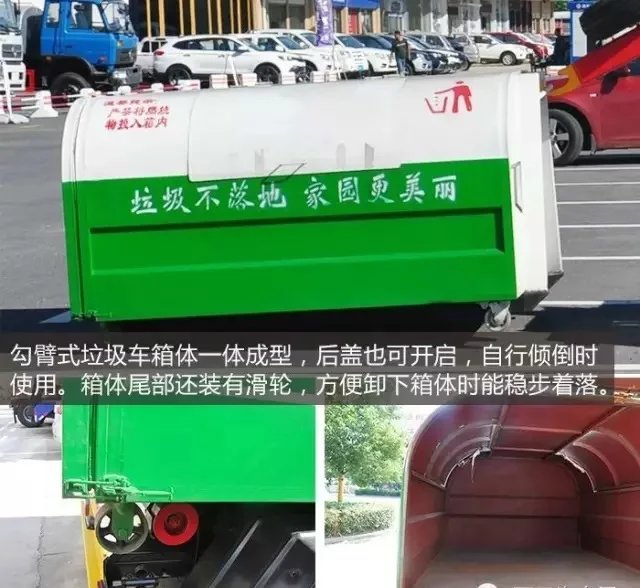 掛桶式垃圾車廂體為全金屬密封式結(jié)構(gòu),卸料時能從后部打開。廂體的前右側(cè)設(shè)有進料口,廂體的后部設(shè)有開啟門。勾臂式垃圾車箱體一體成型,后蓋也可開啟,自行傾倒時使用。箱體尾部還裝有滑輪,方便卸下箱體時能穩(wěn)步著落。