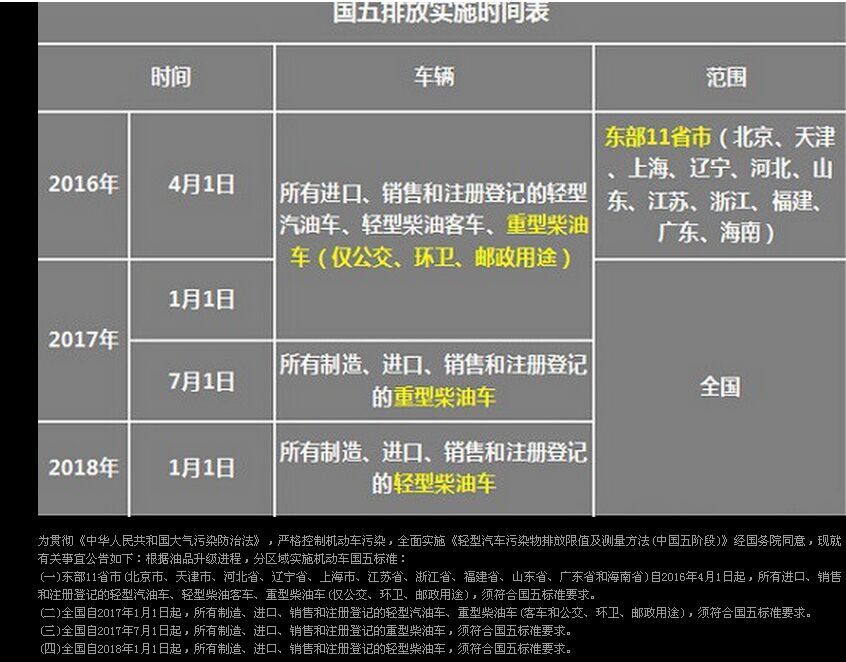 《通告》提出,自2017年7月1日起,在本市注冊登記或轉入本市的重型柴油車和輕型柴油客車執(zhí)行國Ⅴ排放標準。自2018年1月1日起,在本市注冊登記或轉入本市的除客車以外的輕型柴油車,執(zhí)行國Ⅴ排放標準。