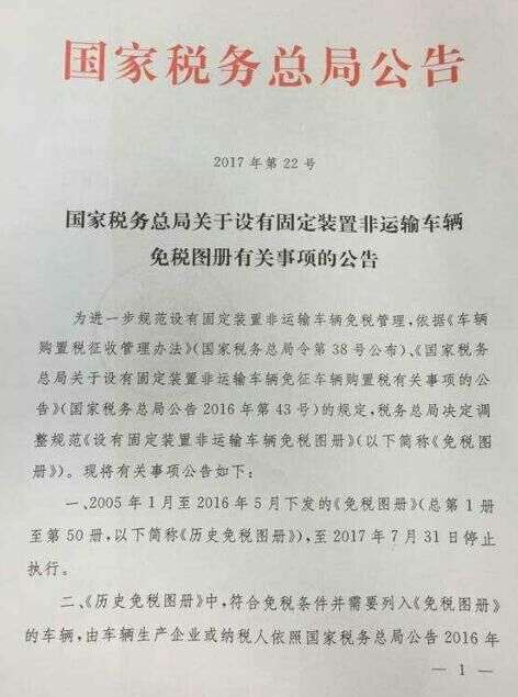 依據(jù)《中華人民共和國(guó)車輛購(gòu)置稅暫行條例》和《車輛購(gòu)置稅征收管理辦法》(國(guó)家稅務(wù)總局令第33號(hào)公布,國(guó)家稅務(wù)總局令第38號(hào)修改),現(xiàn)將設(shè)有固定裝置非運(yùn)輸車輛免征車輛購(gòu)置稅有關(guān)事項(xiàng)公告如下:
