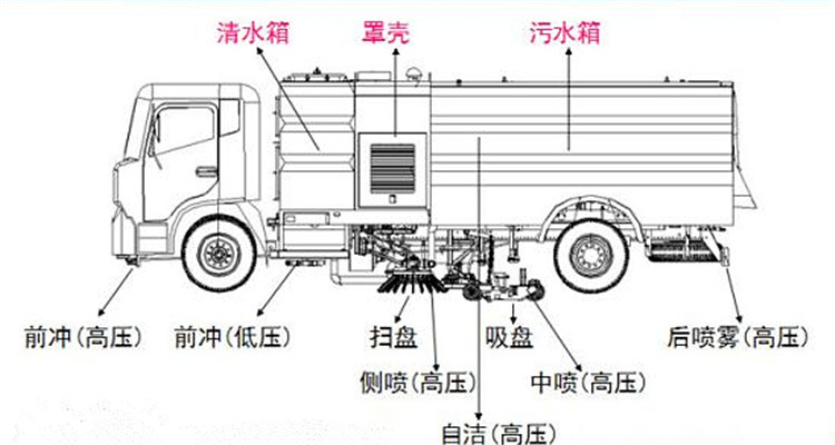 更簡單的說就是,洗掃車比掃路車多加裝一個高壓水泵,加大了水箱容積,加大了副發(fā)動機馬力。