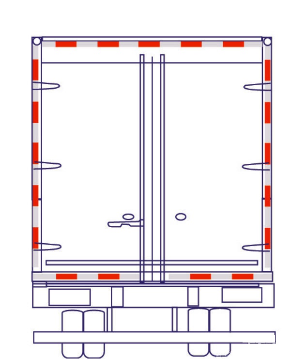 后部車身反光標(biāo)識應(yīng)盡可能體現(xiàn)車輛后部寬度和高度,水平粘貼的反光標(biāo)識體現(xiàn)的是車輛后部的寬度,兩側(cè)邊緣垂直粘貼的是體現(xiàn)車輛后部的高度,所以貨廂后部邊角相交的部分應(yīng)為白色單元,更能清楚的展示出車輛后部的輪廓。