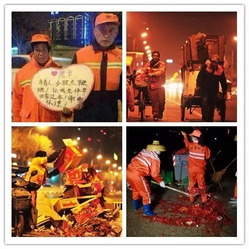 “少放點(diǎn)鞭炮,讓我老伴早點(diǎn)回家過(guò)年!”,2017年2月4日,一張環(huán)衛(wèi)工夫婦呼吁少放鞭炮的圖片在微博、微信朋友圈中瘋傳。