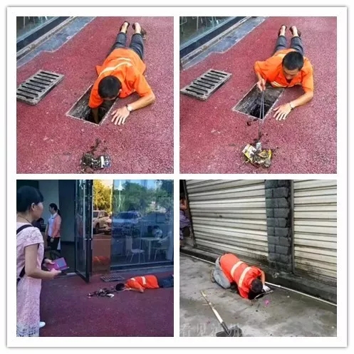 照片上的這一幕,是他正在帕緹歐香小區(qū)門口清理下水道。窨井蓋下很多垃圾,窨井又很深,他只有一根火鉗,只能整個(gè)人趴在地上,頭鉆進(jìn)窨井,才能夠得著井下的垃圾。于是,他就這樣趴在地上清掏了半個(gè)多小時(shí)。撿起了磚頭、白色垃圾等雜物。