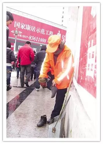 4,42歲的女環(huán)衛(wèi)工孫美蘭,已經(jīng)連續(xù)4天在她的轄區(qū)內(nèi)清掃積雪,而當(dāng)天她已是第三次更換被雪水浸濕的襪子了。