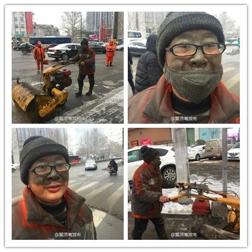 2017年2月22日,山東濟(jì)南。一位環(huán)衛(wèi)工人的臉上沾滿了機(jī)器噴出來(lái)的灰色水漬。他身上的橙色環(huán)衛(wèi)工服,也完全看不出原來(lái)的樣子。他們凌晨2點(diǎn)多就到街頭清理積雪,一直持續(xù)到8點(diǎn),連口水都沒(méi)喝。
