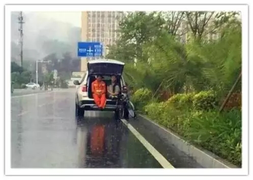 13這是路過(guò)司機(jī)拍下的一幕:廣東珠海突降暴雨,一名環(huán)衛(wèi)工無(wú)處避雨。民警張先生駕車經(jīng)過(guò),他停下車,對(duì)環(huán)衛(wèi)工說(shuō):“快上車,我送你回去”?!安恍?,我還沒(méi)有掃完路,而且單車也放不進(jìn)去”。于是出現(xiàn)這一幕:張先生打開(kāi)后尾箱蓋,陪著他一起避雨……