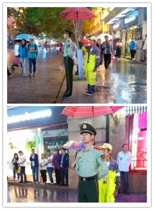 14哈爾濱中央大街上,一名武警戰(zhàn)士在路邊站崗,突然降下大雨。行人紛紛避雨或撐起雨具,這時(shí)一名環(huán)衛(wèi)工人,出現(xiàn)在了武警戰(zhàn)士的身后,伸長(zhǎng)手臂,把雨傘打在了他的頭頂?;蛟S,戰(zhàn)士已經(jīng)在雨中站了很長(zhǎng)時(shí)間;或許,環(huán)衛(wèi)大哥已經(jīng)勞累了一整天。