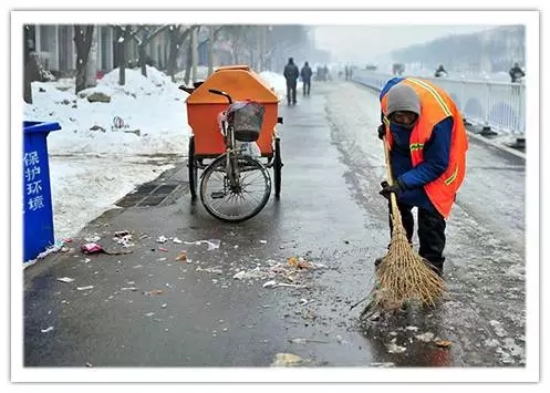 17據(jù)央視報(bào)道,我國(guó)目前環(huán)衛(wèi)工中有八成為臨時(shí)工,他們的工資不到全國(guó)城鎮(zhèn)在崗職工月平均工資的一半。2012年12月28日,河南省遂平縣建設(shè)路,78歲的張秀榮在冰天雪地里打掃衛(wèi)生。她從1976年就開(kāi)始做環(huán)衛(wèi)工,已經(jīng)干了36年,一直都是臨時(shí)工身份,沒(méi)有社保和醫(yī)保。