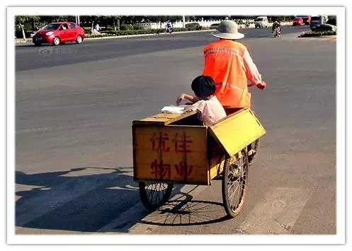 2012年6月19日下午4時(shí)許,在江蘇省徐州市銅山新區(qū)北京路上,一位年邁的環(huán)衛(wèi)工人騎著環(huán)衛(wèi)車外出工作,自己的小孫女蝸盤在環(huán)衛(wèi)車?yán)飳?xiě)作業(yè)。