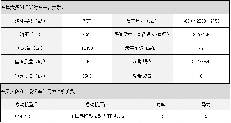 東風(fēng)大多利卡吸污車主要技術(shù)參數(shù):