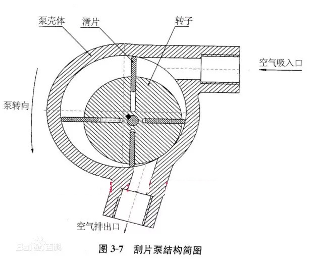 刮片泵的轉(zhuǎn)子偏心的裝在殼體內(nèi),轉(zhuǎn)子轉(zhuǎn)動(dòng)時(shí)產(chǎn)生離心力,在該離心力作用下,分布在轉(zhuǎn)子滑槽內(nèi)的葉片向外滑動(dòng),并與泵殼體內(nèi)表面接觸,把轉(zhuǎn)子與殼體之間分隔成許多小空間,具有吸排氣作用。