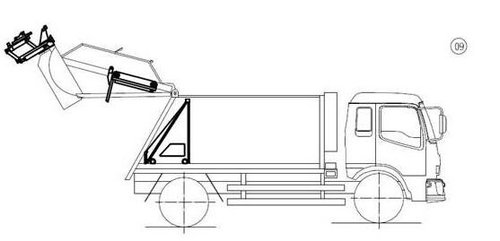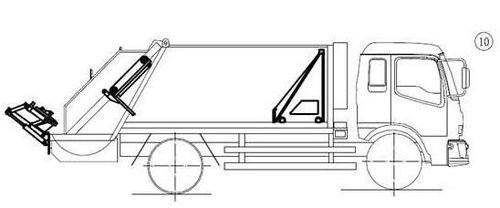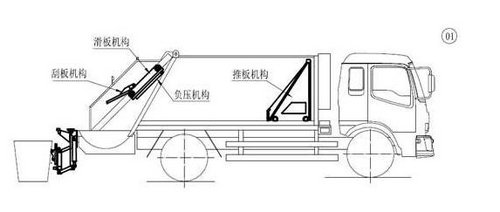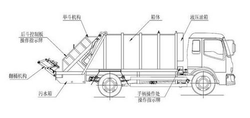在眾多垃圾車車型中,壓縮垃圾車車型結(jié)構(gòu)最為復(fù)雜。其工作過(guò)程除了普通垃圾車具備的垃圾裝卸功能外,在垃圾裝運(yùn)的同時(shí)利用舉升及液壓裝置完成垃圾的壓縮過(guò)程。以下是垃圾車工程部提供給我們的壓縮式垃圾車結(jié)構(gòu)示意圖: