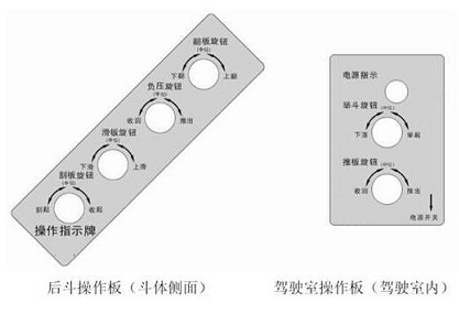 1.旋轉(zhuǎn)壓縮式垃圾車翻桶(板)操作旋鈕至左下翻位,使翻桶(板)機(jī)構(gòu)放下,松開(kāi)旋鈕回中位,然后旋轉(zhuǎn)刮板操作旋鈕至右收起位,刮板收起,松開(kāi)旋鈕回中位,準(zhǔn)備開(kāi)始掛桶。如圖: